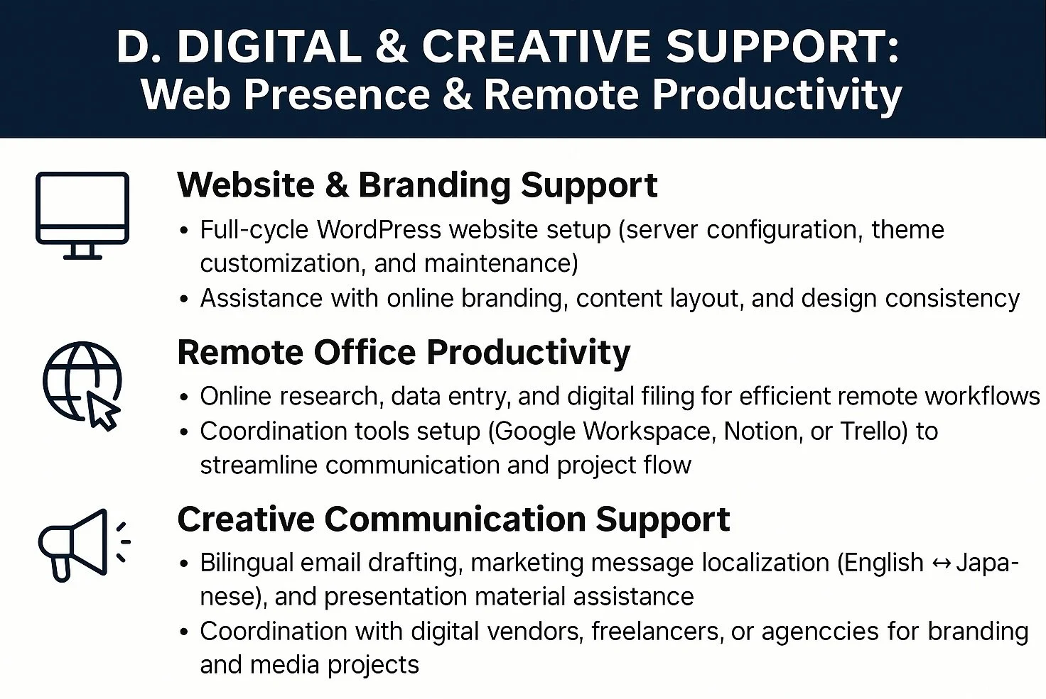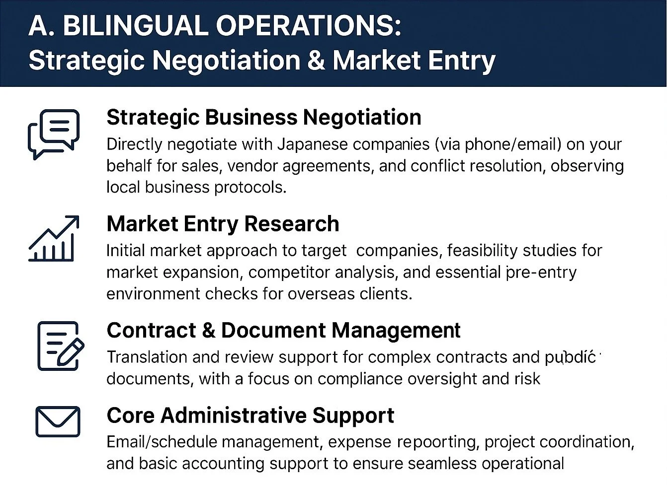 Life and work in Japan are exciting, but complex procedures often steal your precious time and energy. Built on expert local knowledge, we solve every challenge—from visas and contract management to daily bookings—as your dedicated personal partner. Let's free up your stress, so you can focus on what truly matters.